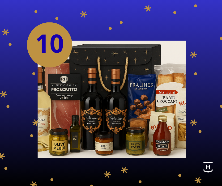 In het cadeaupakket vind je: 1 fles Velarino Susumaniello Puglia 750 ML | 1 fles Velarino Nero di Troja Puglia 750 ML | 1 fles Velarino Vermentino Puglia 750 ML | 1 pak Rumo Penne Rigate no. 28 500 GR | 1 fles Agromonte Authentieke Pastasaus Sicilië | 1 flesje Olijfolie | 1 potje Groene Olijven zonder pit | 1 potje Pesto Verde | 1 potje Pesto Rosso | 1 pak Stiratini Pane Crocante | 1 zak Maitre Truffout Pralines Selection 300 GR