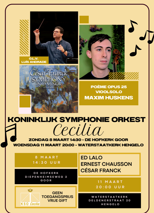 Het Koninklijk Symphonie Orkest Cecilia geeft onder leiding van dirigent Luís Andrade op zondagmiddag 8 maart en op woensdagavond 11 maart een concert met de in Enschede geboren violist Maxim Huskens.