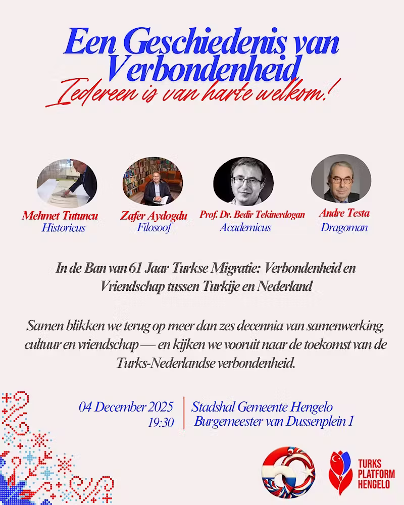 Het jaar 2024 markeerde twee bijzondere mijlpalen: 60 jaar Turkse arbeidsmigratie en 100 jaar diplomatieke betrekkingen tussen Nederland en Turkije. Ter gelegenheid van deze herdenkingen organiseren wij graag een lezing in de stadshal van de gemeente Hengelo. Het doel van deze bijeenkomst is om meer inzicht te krijgen in zowel de historische context als de actuele maatschappelijke vraagstukken rondom identiteit, migratie en integratie.