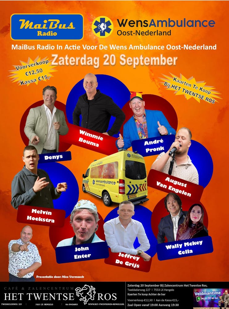 Een Nederlandstalige muziek avond van MaiBus Radio in samenwerking met zalencentrum “Het Twentse Ros” om geld in te zamelen voor “De Wens Ambulance Oost Nederland”, om zo een laatste wens in vervulling te kunnen laten gaan voor één ieder die dat nog graag wil maar om medische reden het lastiger word. Zie Flyer welke artiesten die avond gaan komen.